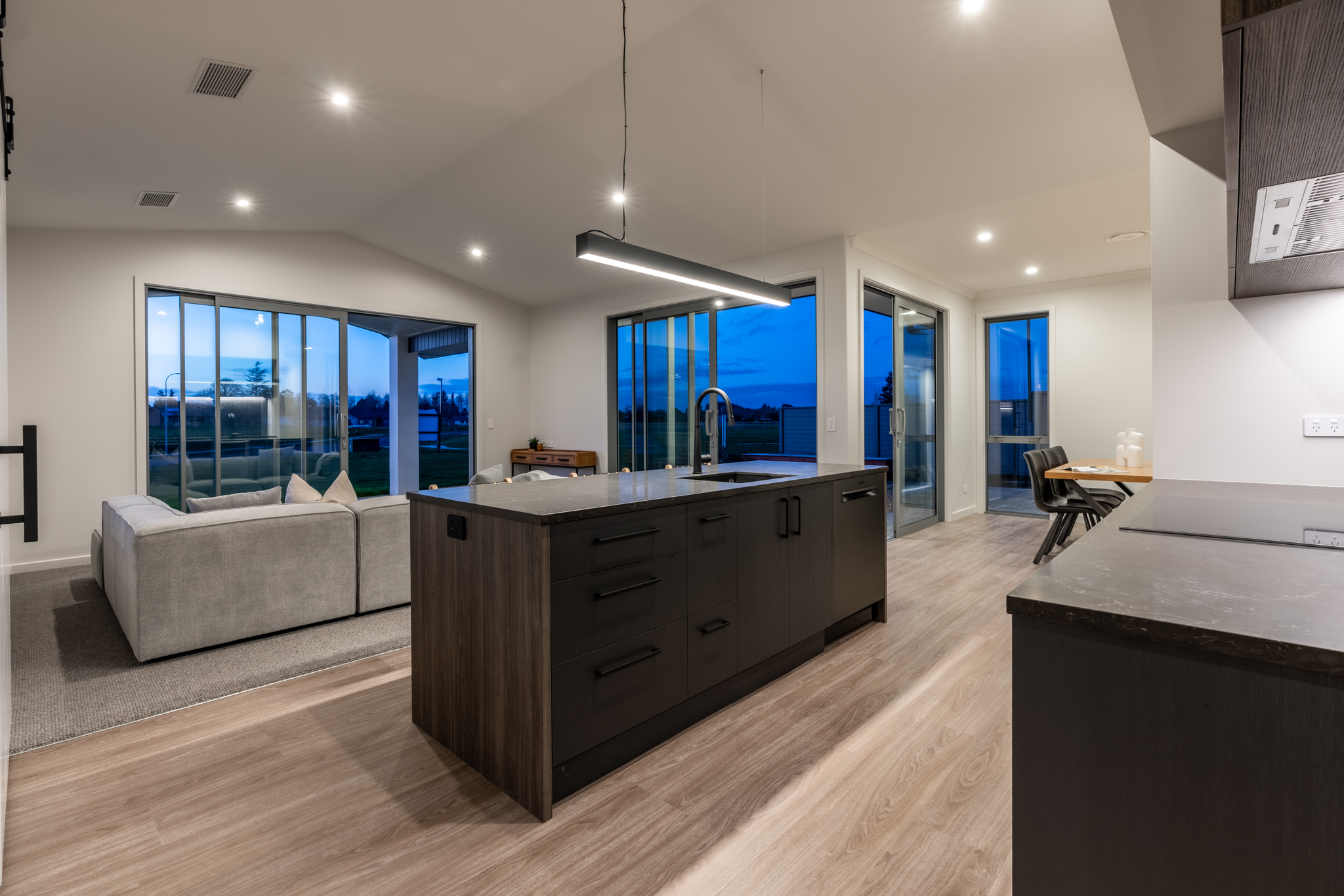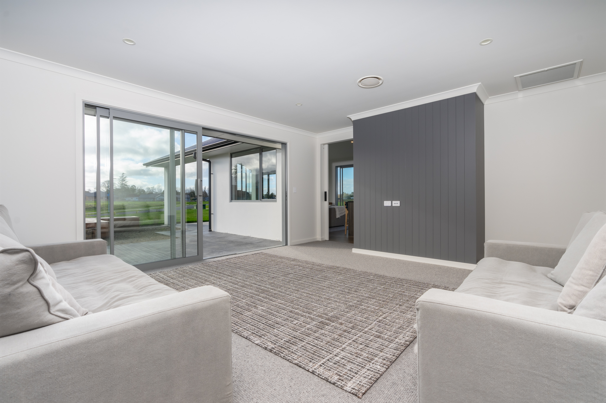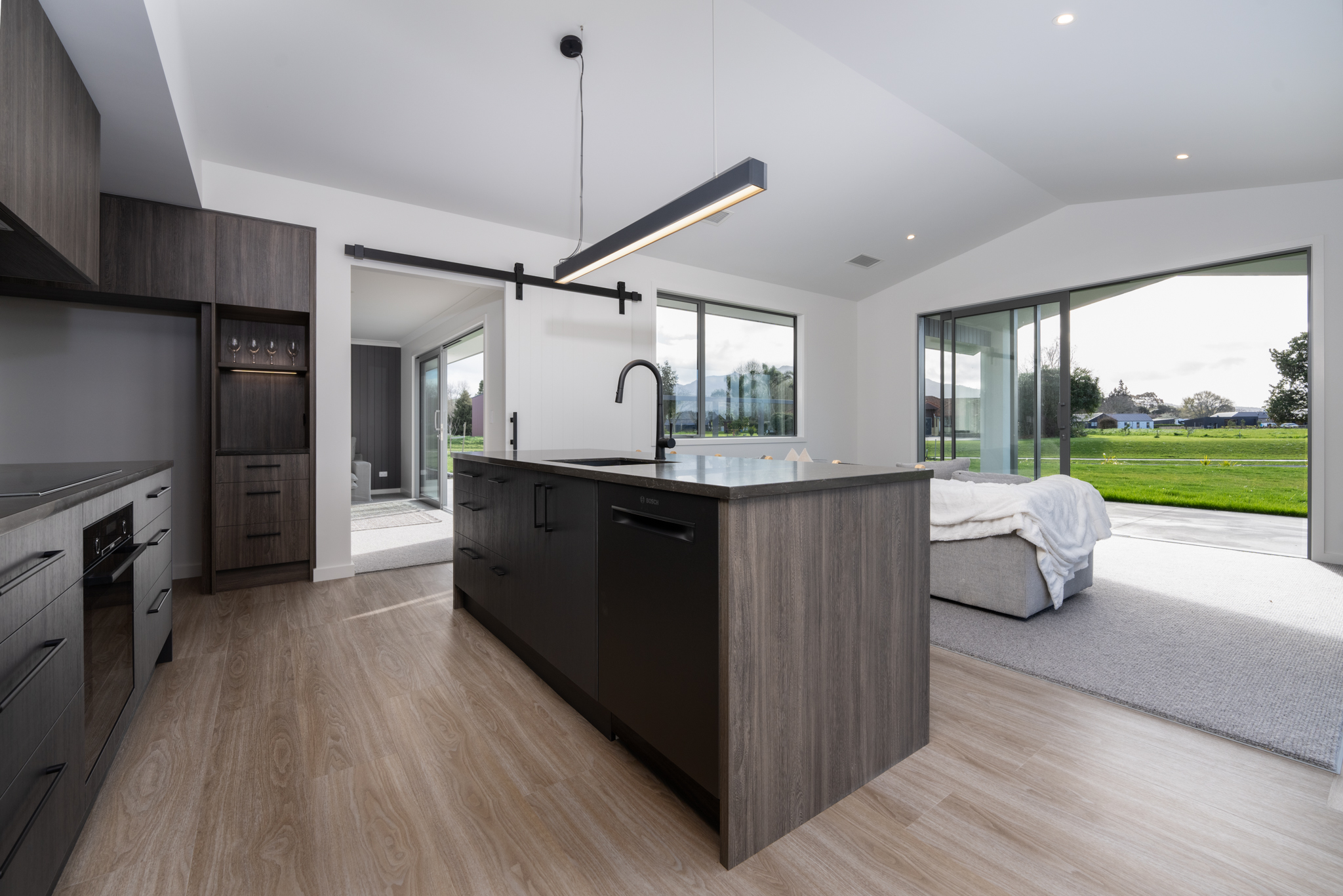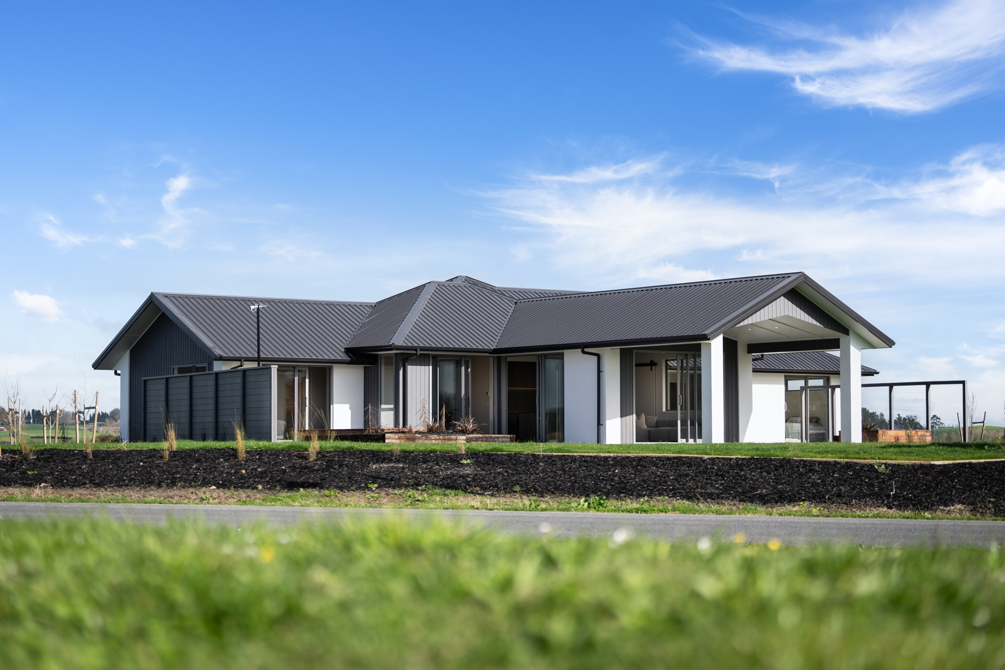 Collinson Plan Pukekura - House & Land Package - Our Collinson plan is a family-oriented design with four bedrooms, two bathrooms, two living areas, an office and a covered outdoor area. Clad in a mix fibre-cement BGC and plastered concrete panel Celcrete, the exterior gives a stylish modern appeal while remaining low-maintenance. Images are of our Collinson plan built previously.